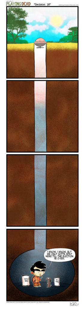 Decision 16 by cgugliotti on November 3, 2016 at 9:00 am Chapter: comicsCharacters: chris, nibbles In which we choose the best course of action. └ Tags: america, anxiety, autobiographical, chris gugliotti, clinton, clinton2016, comic, comic strip, dachshund, democracy, democrat, dog, donald trump, election, election day, election2016, friendship, hillary, hillary clinton, hillary2016, horror, introspection, life, man's best friend, man-child, nibbles, nibbles the dachshund, playing dead, republican, trump, trump2016, vote, voting, web comic, webcomics, wtf Comments Off on Decision 16