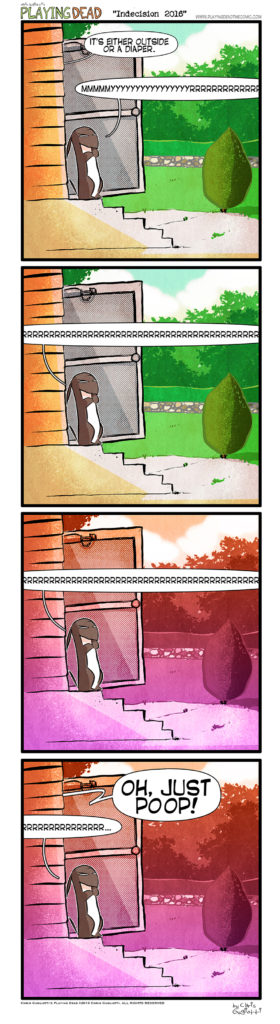 Indecision 16 by cgugliotti on November 8, 2016 at 9:00 am Chapter: comicsCharacters: nibbles In which Nibs tries to make a very important choice. └ Tags: anxiety, autobiographical, chris gugliotti, comic, comic strip, dachshund, decision, dog, election, election day, friendship, indecision, introspection, life, man's best friend, Nature, nibbles, nibbles the dachshund, outside, playing dead, trump, web comic, Web comics, webcomic, webcomics, wtf 1 Comment