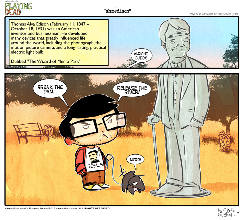 Smedison by cgugliotti on April 4, 2013 at 8:54 am Chapter: comics In which we pay “tribute” to the Wizard of Menlo Park……VIVA LA TESLA!!! └ Tags: autobiographical, chris gugliotti, comic, comic strip, dacshund, dog, Edison, friendship, invention, inventors, man's best friend, man-child, nibbles, Nikola Tesla, playing dead, science, tesla, Tesla versus Edison, The Wizard of Menlo Park, Thomas Alva Edison, Thomas Edison, vengeance, web comic 1 Comment