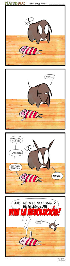 The Long Con by cgugliotti on January 19, 2017 at 9:00 am Chapter: comicsCharacters: nibbles In which the cold dish of revenge will be served! └ Tags: anxiety, autobiographical, chew toy, chew toys, chris gugliotti, comic, comic strip, dachshund, dog, dog toy, Dog toys, fantasy, friendship, life, man's best friend, nibbles, nibbles the dachshund, playing dead, revenge, revolution, vengeance, web comic, webcomic, wtf 1 Comment