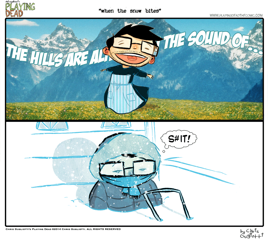 When the Snow Bites by cgugliotti on January 14, 2014 at 7:57 am Chapter: comics In which the cold weather takes it’s toll on my sanity. └ Tags: Animated, autobiographical, chris gugliotti, comic, comic strip, dachshund, Gif, introspection, julie andrews, life, man-child, musical, playing dead, snow, sound of music, the sound of music, von trapp, web comic, Web comics, webcomic, webcomics, winter 1 Comment
