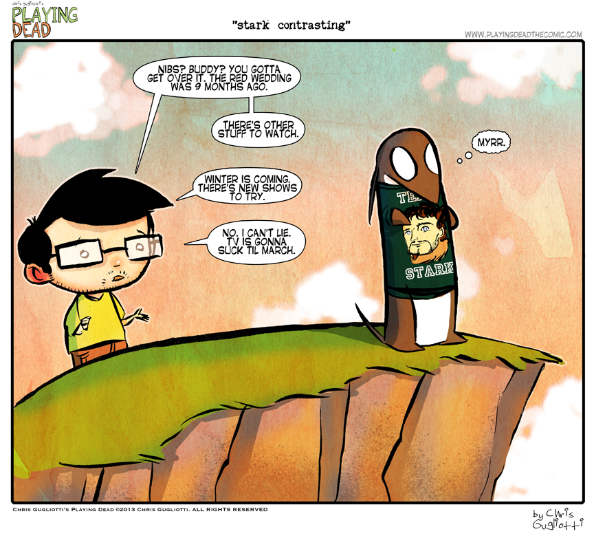 Stark Contrasting by cgugliotti on November 21, 2013 at 7:58 am Chapter: comics In which Nibbles has trouble moving on. └ Tags: autobiographical, chris gugliotti, comic, comic strip, dachshund, dog, friendship, game of thrones, introspection, life, man's best friend, nibbles, playing dead, television, tv, web comic, Web comics, webcomic, webcomics, winter is coming 1 Comment