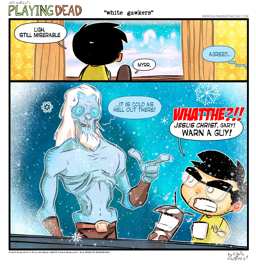White Gawkers by cgugliotti on February 12, 2015 at 9:00 am Chapter: comics In which it’s not fit for man nor zombie out there. └ Tags: autobiographical, chris gugliotti, comic, comic strip, dachshund, dog, fantasy, game of thrones, george r.r. martin, life, magic, man's best friend, man-child, monster, nibbles, playing dead, science fiction, snow, the wall, web comic, Web comics, webcomic, webcomics, white walker, winter, winter is coming Comments Off on White Gawkers