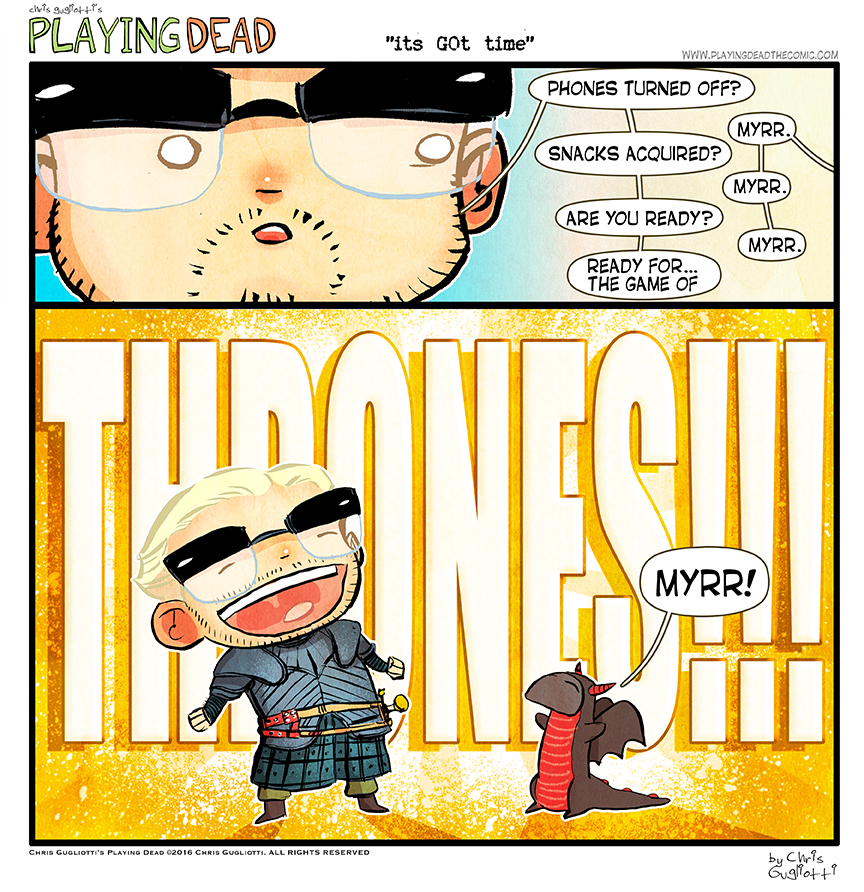 It’s GOt Time by cgugliotti on April 21, 2016 at 9:00 am Chapter: comics In which the long wait is over…again. └ Tags: autobiographical, brienne of tarth, chris gugliotti, comic, comic strip, cosplay, dachshund, dog, dragon, fantasy, friendship, game of thrones, george r.r. martin, hbo, man's best friend, man-child, nibbles, nibbles the dachshund, playing dead, thrones, tv, web comic, Web comics, webcomic, webcomics, winter, winter is coming Comments Off on It’s GOt Time