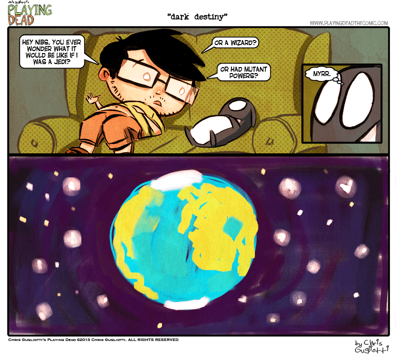 Dark Destiny by cgugliotti on February 28, 2013 at 8:03 am Chapter: comics In which nibbles contemplates the equation: Chris + power= ???? └ Tags: Animated, autobiographical, chris gugliotti, comic, comic strip, dacshund, dog, friendship, Gif, harry potter, introspection, jedi, life, magic, man's best friend, man-child, mutant, myrr, nibbles, playing dead, question, space, Starwars, web comic, webcomic, wizard, x men Comments Off on Dark Destiny