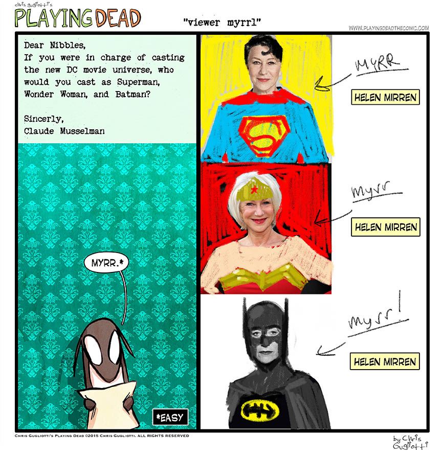 Viewer Myrrl by cgugliotti on September 17, 2015 at 9:00 am Chapter: comics In which Nibbles plays casting agent. └ Tags: autobiographical, batman, chris gugliotti, comic, comic books, comic strip, dachshund, dame helen mirren, dc, dc comic books, dc comics, dog, doxie, fantasy, friendship, helen mirren, introspection, life, man's best friend, man-child, nibbles, playing dead, science fiction, superman, the batman, web comic, Web comics, webcomic, webcomics, wonder woman Comments Off on Viewer Myrrl