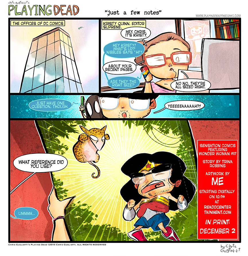 Just a Few Notes by cgugliotti on October 1, 2015 at 9:00 am Chapter: comics In which beauty is in the eye of your editor’s beholders. └ Tags: anxiety, autobiographical, batman, cheetah, chris gugliotti, comic, comic book, comic books, comic strip, dachshund, dc, dc comic books, dc comics, dog, friendship, introspection, kristy quinn, life, man's best friend, man-child, nibbles, nibbles the dachshund, playing dead, web comic, Web comics, webcomic, webcomics, wonder woman Comments Off on Just a Few Notes