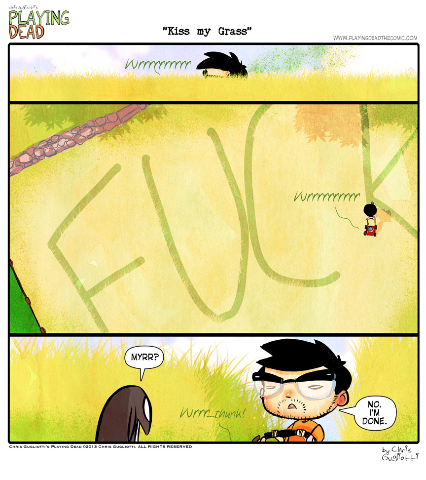 Kiss my Grass by cgugliotti on July 17, 2014 at 7:51 am Chapter: comics In which I take a stand in the never ending battle between man and lawn. └ Tags: anxiety, autobiographical, chris gugliotti, comic, comic strip, dachshund, friendship, frustration, grass, introspection, lawn, Lawn care, lawnmower, life, nibbles, playing dead, swearing, web comic, Web comics, webcomic, webcomics, yardwork Comments Off on Kiss my Grass